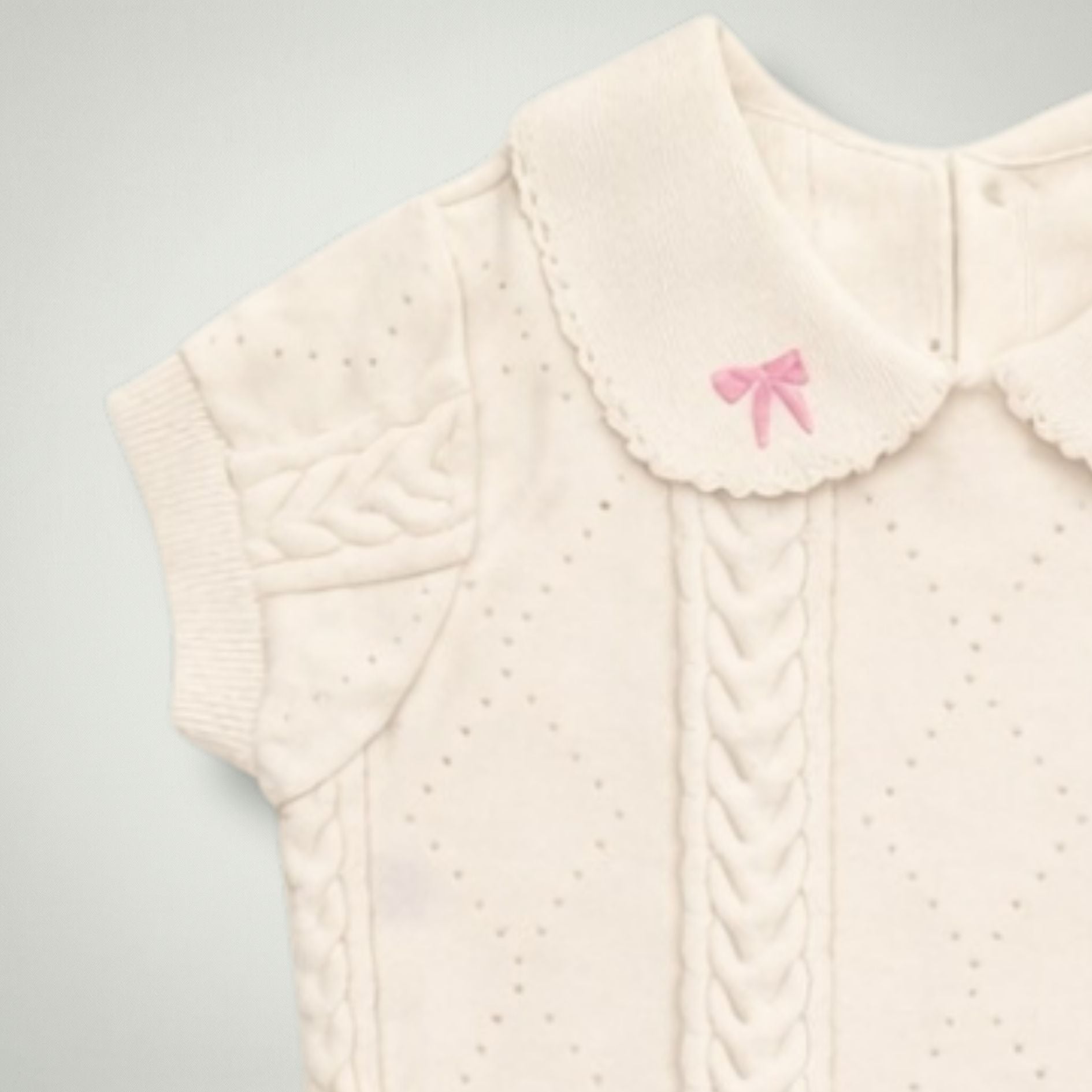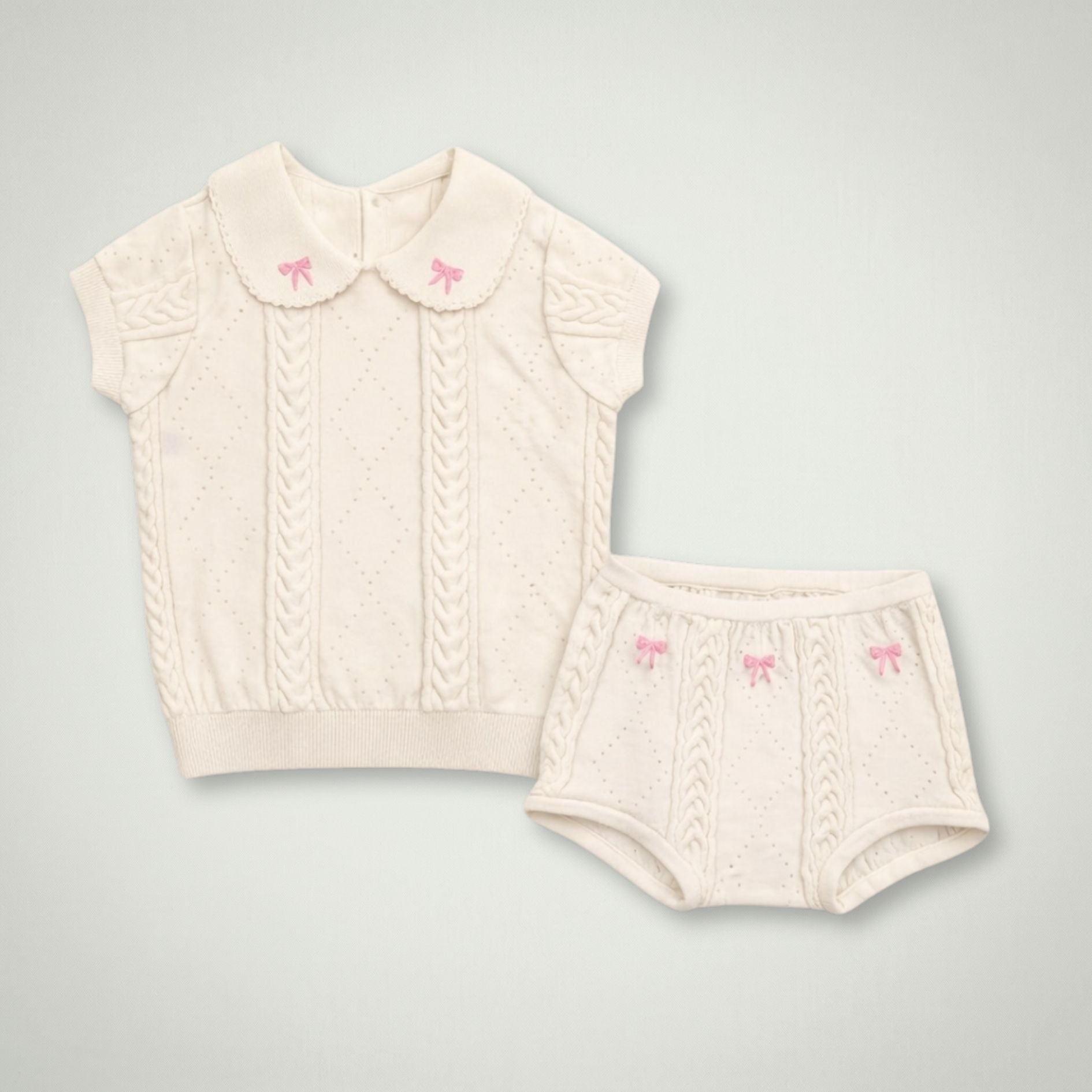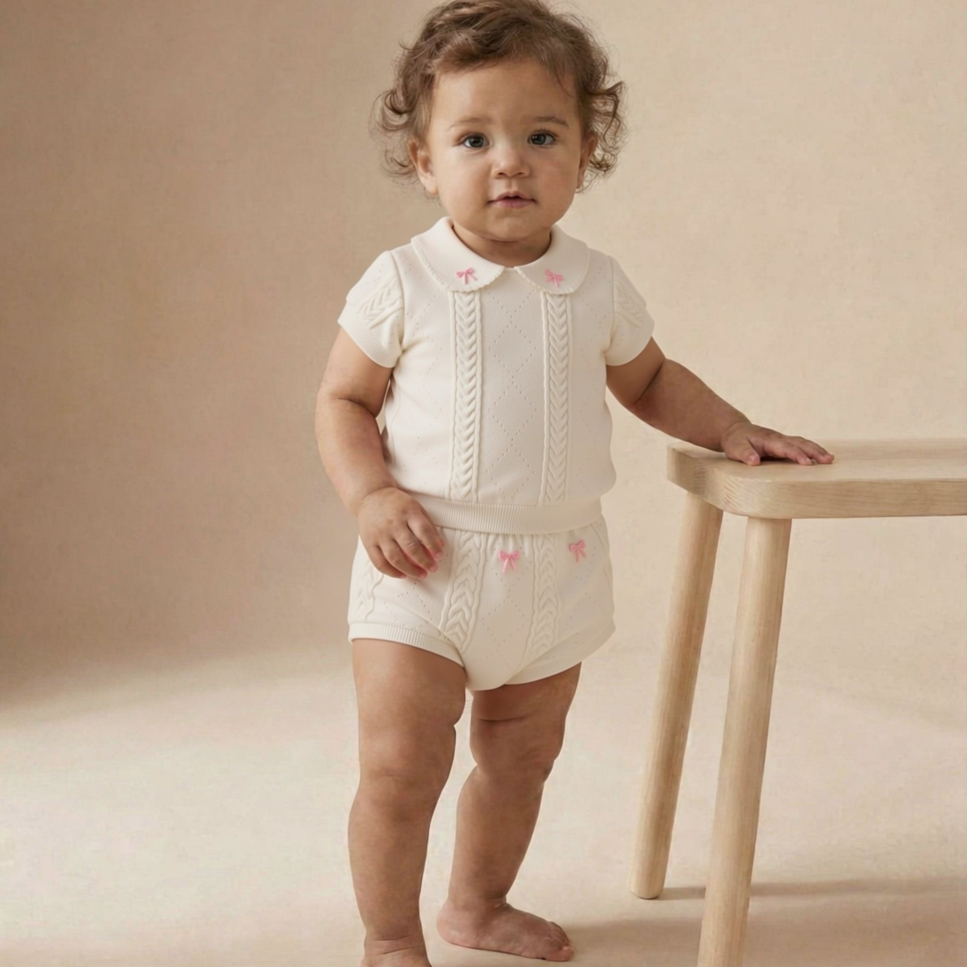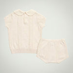 Featuring a beautifully textured knit top with a classic collar detail and subtle embroidered accents, the Helly Set blends traditional charm with modern comfort. The matching knit bottoms complete the look, offering an elasticated waistband for easy wear and all-day comfort.