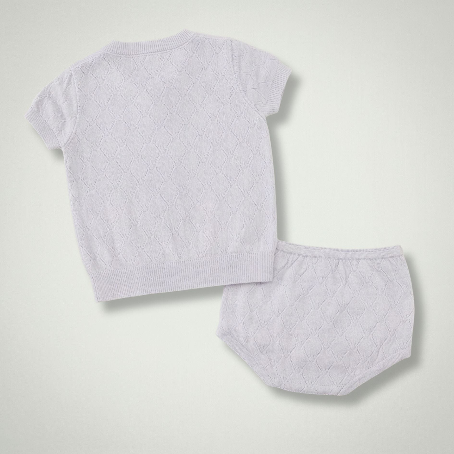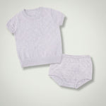 Featuring a beautifully textured finish, the set includes a short-sleeve knit top with a relaxed fit and matching elasticated bloomers for a secure yet comfortable feel. Designed for effortless styling, this versatile set is available in two soft shades — Light Pink and Lavender — perfect for mixing, matching, or wearing as a complete look.