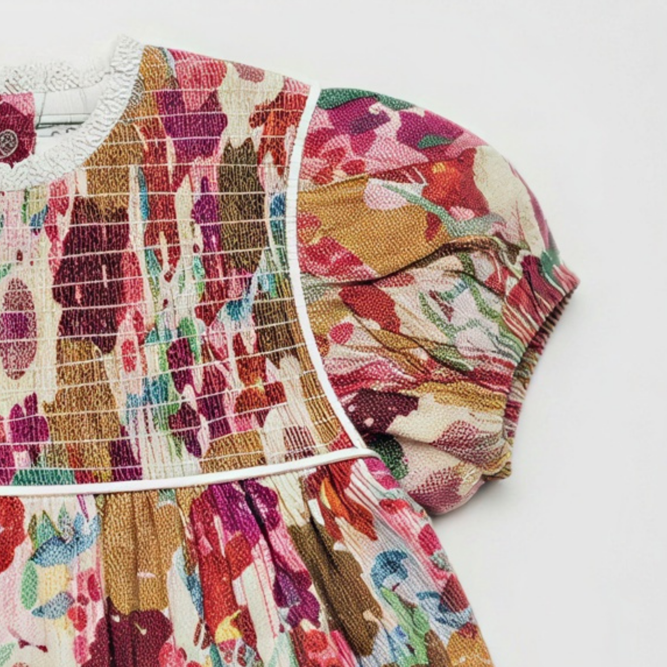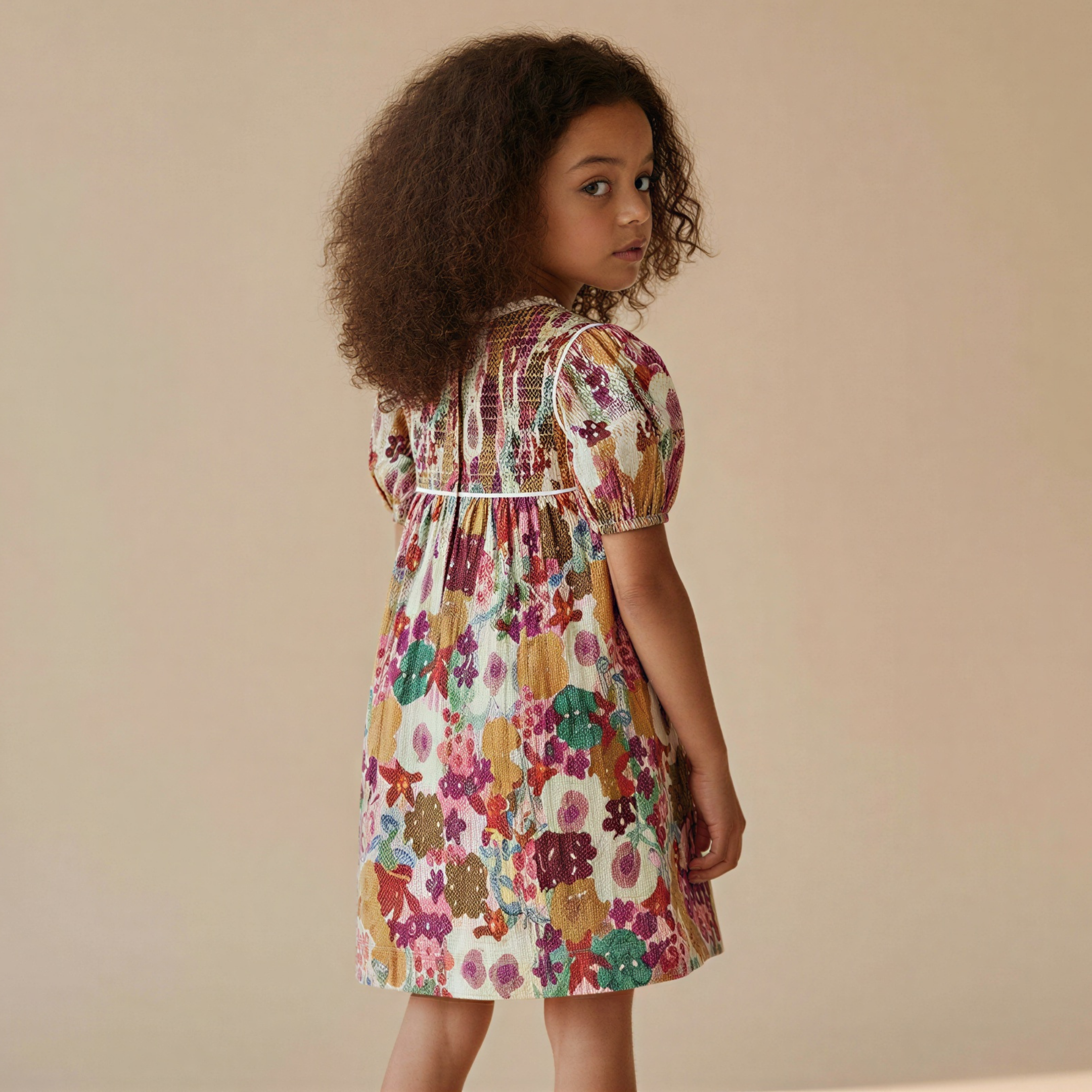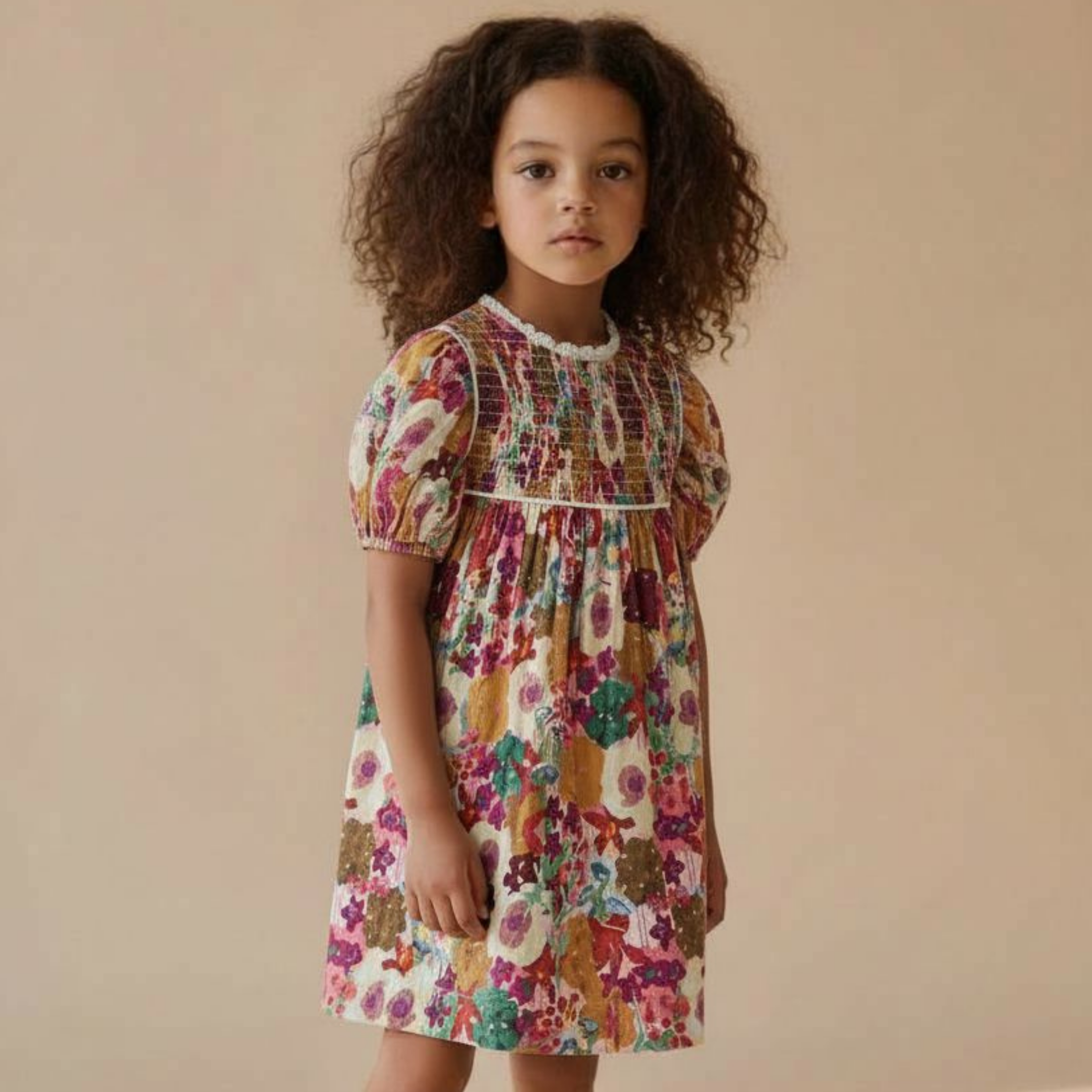 Featuring a beautiful vintage-inspired floral print in warm pink, green, and earthy tones, this dress is finished with a delicate shirred bodice panel and softly gathered skirt for a relaxed yet polished look. Short puff sleeves add a sweet, classic touch while ensuring comfort throughout the day.