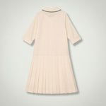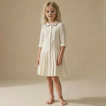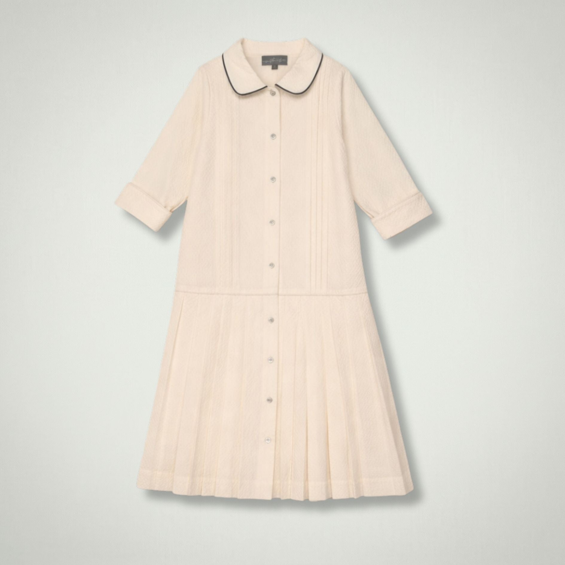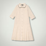 Designed in a soft neutral tone, the Edith Dress features a classic button-through front, a refined rounded collar with contrast piping, and delicate pleated detailing for a polished finish. The long sleeves with turned cuffs add a tailored touch, while the softly flared skirt creates graceful movement for a sophisticated silhouette.